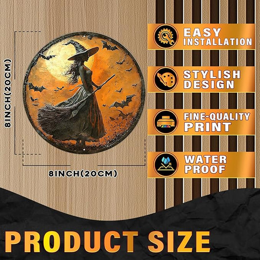 PEACHGARDEN Round 2D Halloween Witch Vintage Sign Halloween Witch Broom Metal Tin Sign for Home Bar Kitchen Hotel Dining Room Coffee 8x8inch