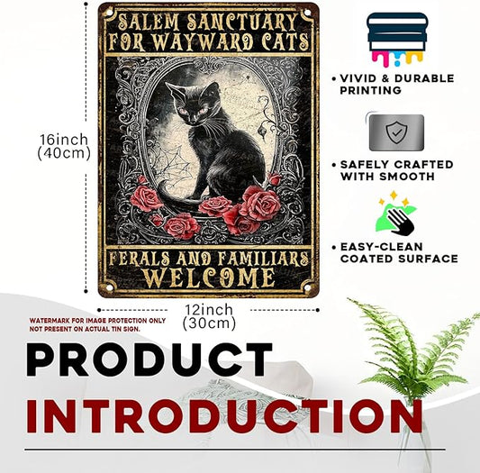 Halloween Black Cat Vintage Sign Salem Sanctuary For Wayward Cats Halloween Metal Sign for Home Bar Kitchen Hotel Dining Room Coffee 12x16inch