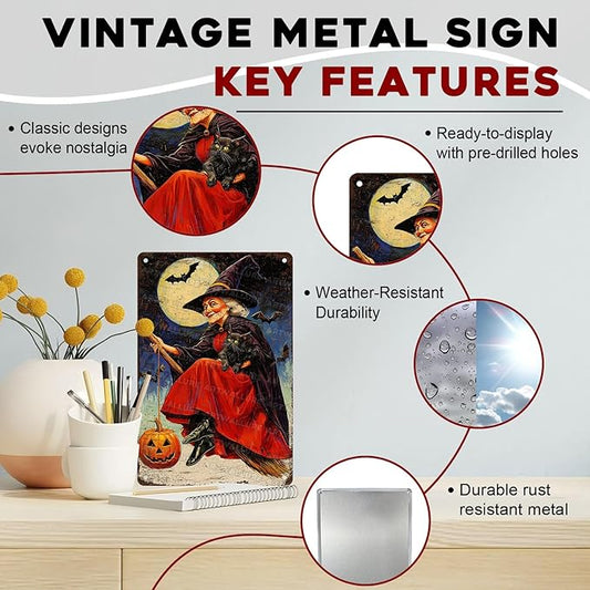 Witch Flying Broom Vintage Sign Halloween Cat Metal Tin Sign Full Moon Bat Pumpkin Poster 8x12inch