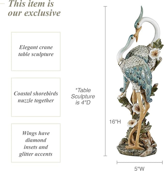 Devoted Cranes Table Sculpture Teal - Made of Resin Coastal Crane Shorebirds - Glitter Accents - Bird Statue - Flowers, Vining Leaves Base - Measures 5 Inches Wide, 16 Inches High