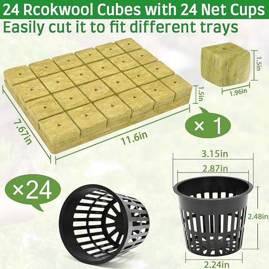 Halatool 24 x 2-Inch Rockwool Cubes & 24 x 3-Inch Net Cups - Hydroponics Starter Kit for Plants Cloning, Seed Starting, and Patio Gardening - Durable, Effective, Great Gift Option