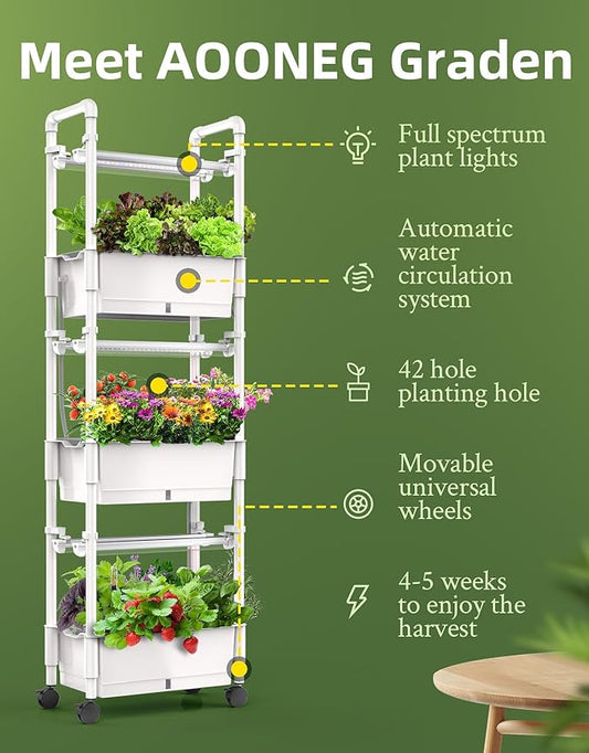 Hydroponics Growing System,AOONEG 42Pods Indoor Herb Garden with LED Grow Light,Hydroponics Growing System Kit with Automatic Timer,Pump System,Adjustable Height (No Seed,Glossy White, 3Layer-42Pods)