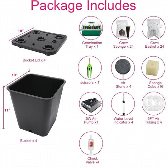 4 Hydroponic Buckets Kit for Plants, Hydroponics Growing System for Herbs/Tomato/Vegetables, DWC System with Air Pump & Germination Tray Black (Complete Indoor Hydroponic Gardening Supplies)