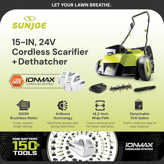 Sun Joe 24V-X2-DTS15 Scarifier and Dethatcher Kit, 5-Depth Positions, 15-inch, Brushless Motor, w/ 2 x 24-V 4.0-Ah Batteries and Dual Port Charger