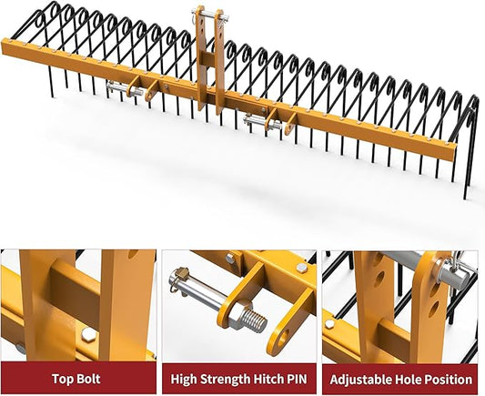 YITAMOTOR 60" Durable Powder Coated Steel Pine Straw Rake Steel Spring Landscape Rake Attaches to Cat-0 Cat-1,3 Point Hitch for Tractor, Yellow