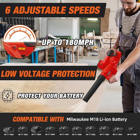 Cordless Leaf Blower for Milwaukee M18 Battery,Electric Jobsite Air Blower with Brushless Motor,6 Variable Speed Up to 180MPH,2-in-1 Handle Electric Blower and Vacuum Cleaner(Battery Not Included)