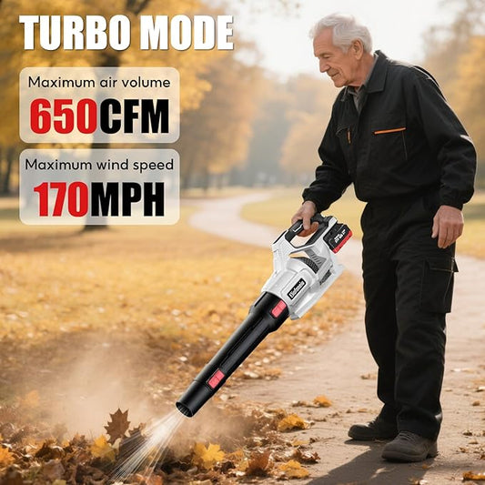 Leaf Blower,Powerful Electric Leaf Blower Cordless,650CFM/170MPH,4 Speed Modes,with 2 * 5.0Ah 21V Batteries and Charger,2*Replacement Nozzle for Lawn Care, Blowing Leaves, Dust, Snow, Gravel Patio