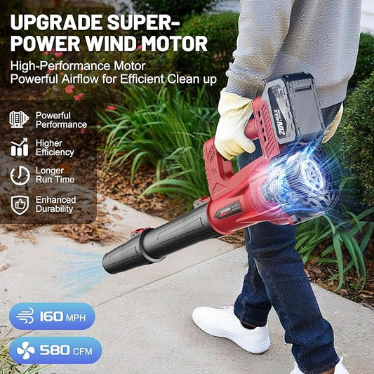 Electric Leaf Blower Cordless with 2X 4.0Ah 21V Battery and Charger,6 Speed Mode 580CFM 160MPH Extension Tube Handheld Blower for Lawn Care,Blowing Leaves,Dust,Snow,Patio,Yard