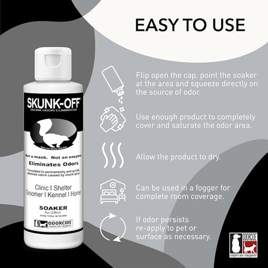 Skunk Off Pet Odor Eliminator Soaker Bottle - Ready to Use Skunk Odor Remover for Dogs, Cats, Home, Car, Clothes & More – Skunk Odor Eliminator Pet Cleaner w/Non-Enzymatic Formula, Safe for Pets, 8oz