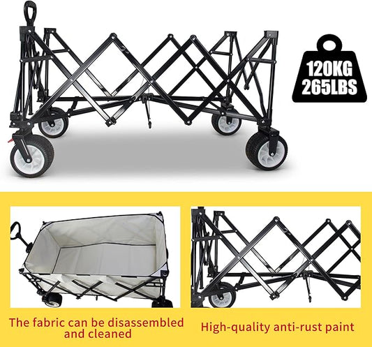 Collapsible Wagon Cart with Silent All-Terrain Wheels, Foldable Heavy Duty Beach Wagon with 330LB,Folding Cart with Cup Holders and Brakes for Camping, Garden,Shopping,Sports Black