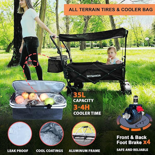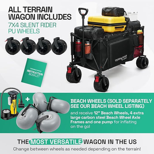 Foldable Beach Wagon Cart- Interchangeable All Terrain Wheels- 12" Beach Wheels Optional- Patent Pending- Gardening, Fishing, Shopping-Built-in Insulated Cooler Pouch, More Storage Pockets, Cupholders
