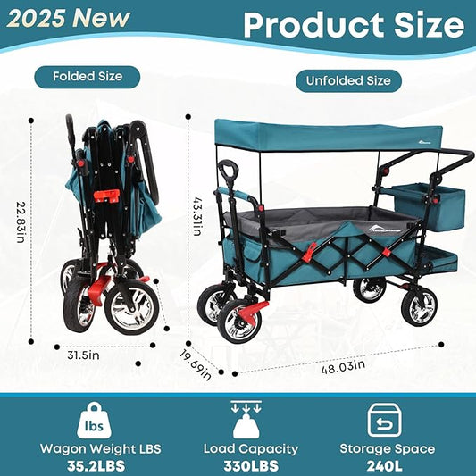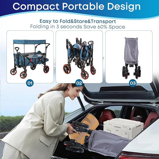Collapsible Canopy Wagon, Foldable Wagon Stroller with 330LBS, Heavy Duty Cart with Shock-Absorbing Wheels, Adjustable Push Pulling Handles for Camping, Garden, Sports, Shopping, Blue