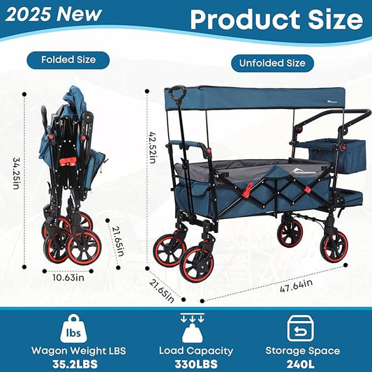 Sports Wagon Carts,480Lbs Double Decker Wagon,Foldable Lounge Wagon with Tank Wheels&Side Pocket&Dustbag,New Wave Garden,Camping,Shopping,Beach Wagon to Family Trips and Outdoors Time-Brown