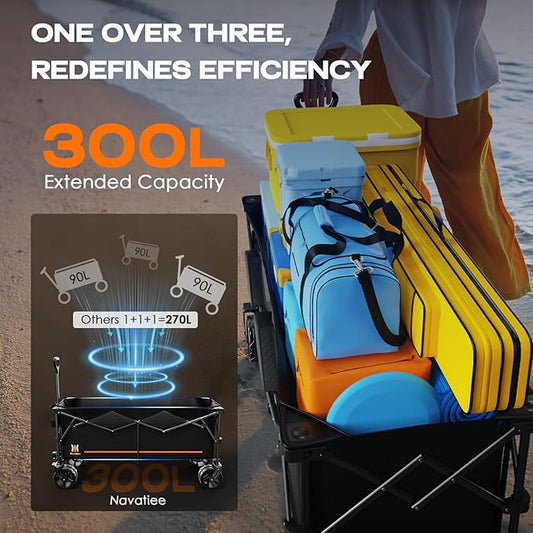 Navatiee 300L Extra Large Collapsible Wagon Cart Foldable, 48''L Extended Heavy Duty Folding Beach Wagon with 440LBS Weight Capacity and Big Wheels, Utility Garden Cart for Sports Camping