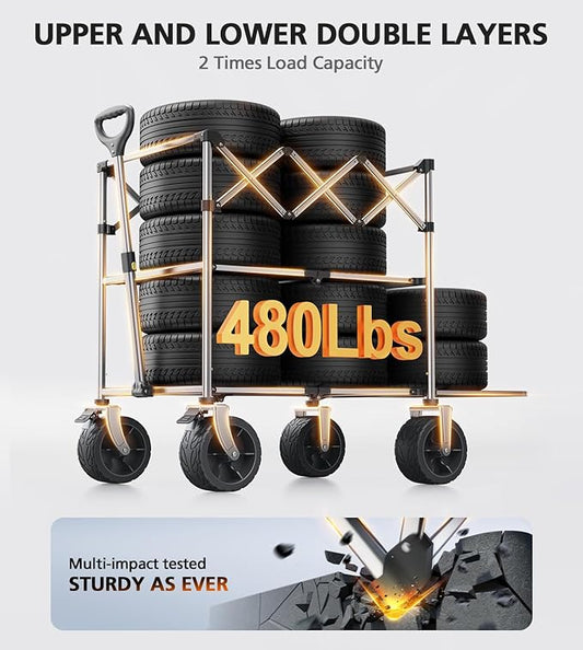Double Decker Wagon, 480Lbs Capacity, Big Wheels & Side Pocket, Folding Wagon for Shopping, Garden, Camping, Fish - Grey