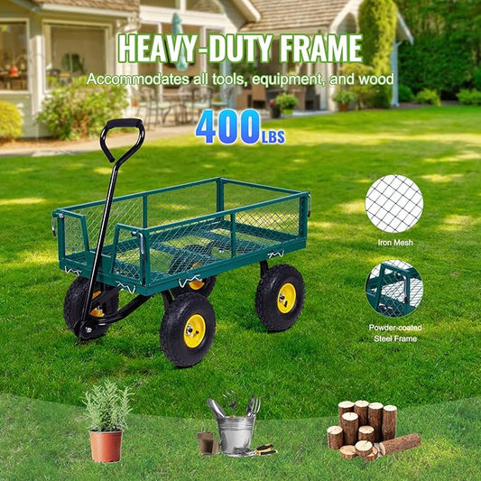 Backyard Expressions Heavy-Duty Steel Garden Cart – 400 lb Capacity, Removable Mesh Sides, Flatbed Convertible Yard Wagon with 10" Pneumatic Tires