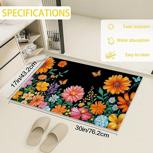 Colorful Flowers Welcome Mat Indoor,Spring Garden Wildflower Butterfly Front Door Mat,Non-Slip Entryway Rug, Low Profile Felt Indoor Doormat for Back Door Porch Patio Entrance,30 x 17 Inch