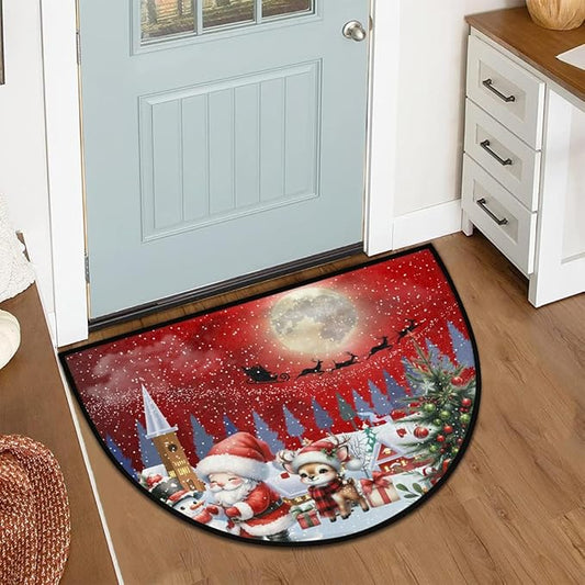 Christmas Half Round Door Mat, Merry Christmas Snow Scene Santa Elk Semicircle Door Mats, Non Slip Area Rug Soft Doormat for Indoor Entrance Wear Resistant Welcome Mat for Garage Patio Home 24 x 36 In
