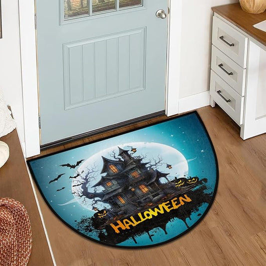 Halloween Half Round Door Mat, Halloween Castle Pumpkin Bats Semicircle Door Mats, Non Slip Area Rug Soft Doormat for Indoor Entrance Wear Resistant Welcome Mat for Garage Patio Home Decor 24 x 36 In