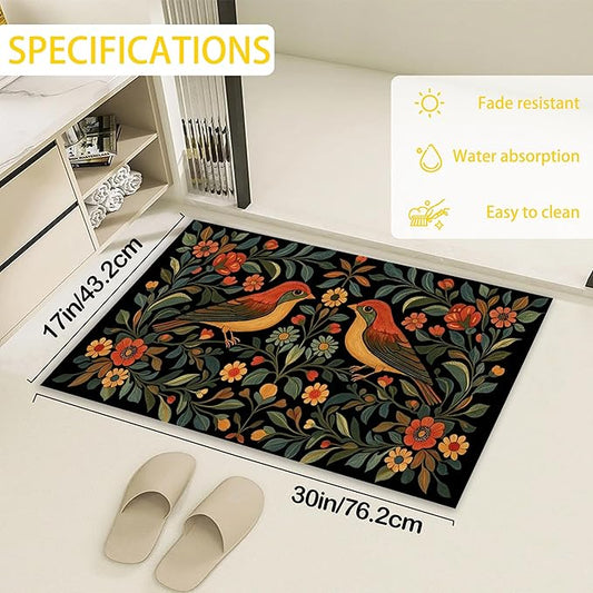 Front Door Mat,Vintage Flowers Birds Doormat Outside Entrance,Non-Slip Rustic Green Leaf Entryway Rug for Porch Patio, Felt Low Profile Welcome Mat Indoor for Hallways, 30 x 17 Inch