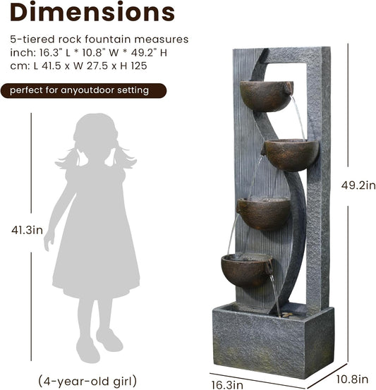 5-Tier Cascading Outdoor Fountain with LED Lights, 49.2" Tall Resin Waterfall Fountain for Garden, Patio, Backyard - Freestanding Water Feature