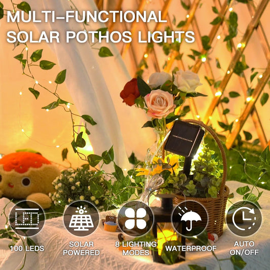 suddus Solar Fairy Lights, 33ft 100 Led Pothos Leaf Solar String Lights Outdoor Waterproof, 8 Modes Vines with Lights for Balcony, Deck, Patio, Garden, Fence,Wedding (Warm White)