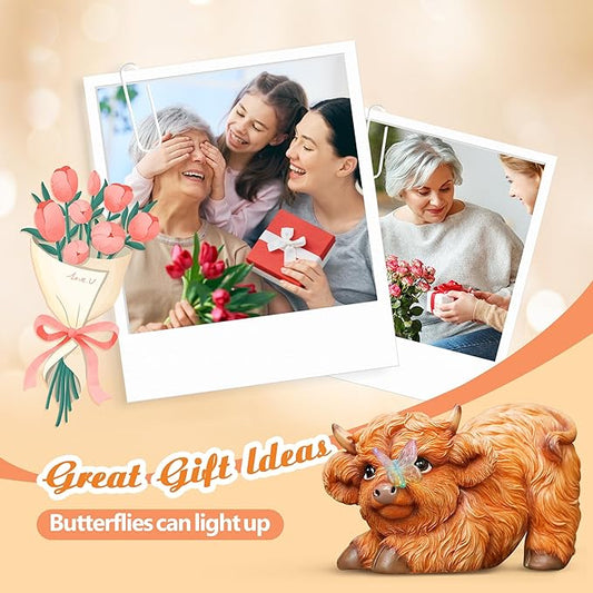 Highland Cow Solar Powered Outdoor Garden Statue, Resin Highland Cow Statue with Solar Light Lantern, Decorative Lawn, Yard Outdoor Highland Cow Decor. Unique Home Decorations, Gifts for Women