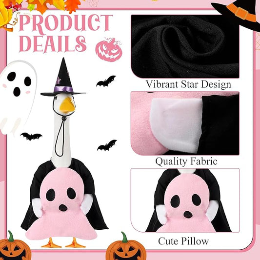Sanwuta 1 Set Halloween Porch Goose Outfit Pink Ghost Pillow Design with Witch Hat for 23" Lawn Cement Goose Porch Geese Clothes Costume for Halloween Garden Patio Yard Outdoor Decorations