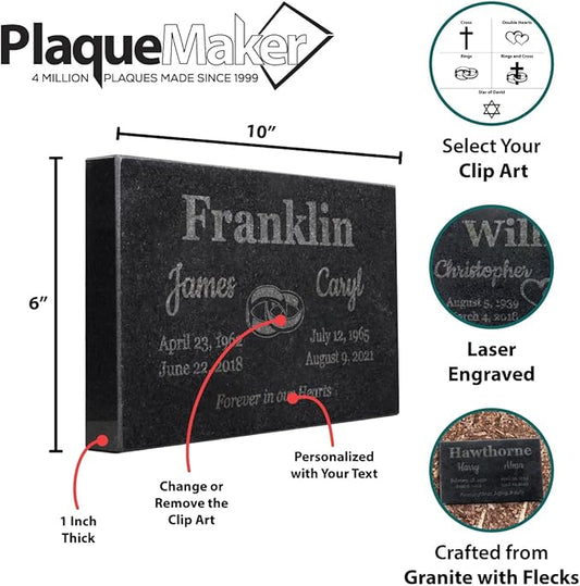PlaqueMaker Black Granite Memorial Headstone for Two Lost Loved - Great for Your Garden, Tree Dedication, or in a Cemetery. Includes Your Text and Select Clipart (10 x 6 x 1)