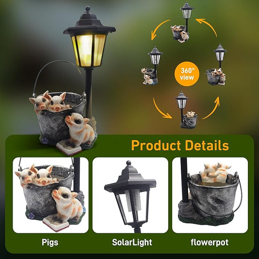 Outdoor Pigs Statues Solar Sculptures with Solar Lights and Flowerpot Funny Garden Decor Animal Figurines Resin Outdoor Statues for Patio Yard Lawn Balcony Gifts
