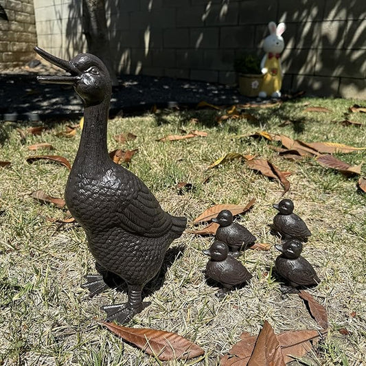 Vintage Cast Iron Duck Family Garden Statue, Rust Brown Mother Duck(15.7" Tall) with 4 Ducklings(3.6" Tall), Outdoor Decorative Sculpture Set for Yard Patio HC5387-6905