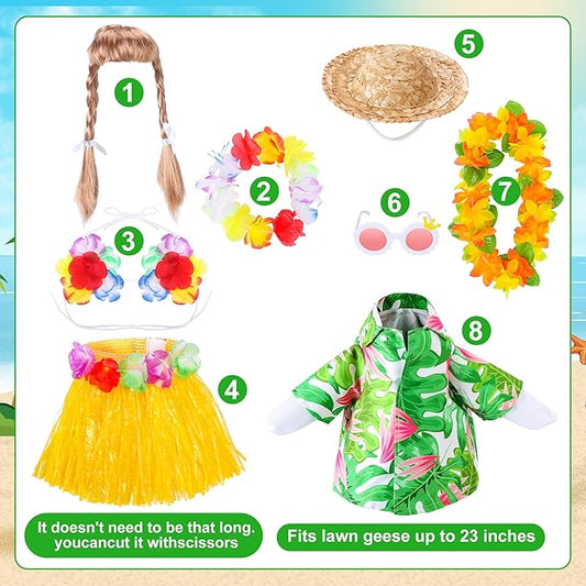 DECOHS 2 Set Hawaiian Porch Goose Outfits, Summer Bikini Lawn Goose Costume, Yard Goose Clothes Grass Skirt Straw Hat with Wreath Glasses Wig for 23" Statue Patio Garden Decoration