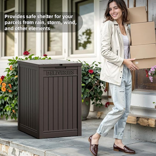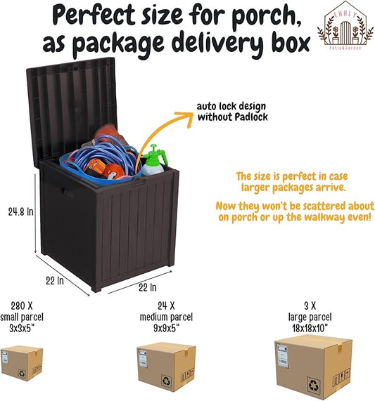Deck Box, 51 Gallon Front Porch Package Bin Delivery Box for Outside, Small Patio Outdoor Storage Boxes Waterproof, UV Resistant Plastic Resin Pool Storage Bins with lids, Brown