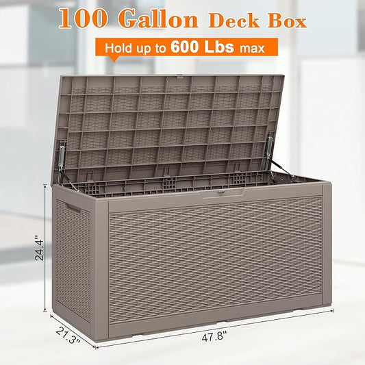 100 Gallon Resin Deck Storage Boxes Outdoor Waterproof, Lockable Outdoor Storage Container for Patio Cushions, Garden Tools, Pool Accessories,Grey