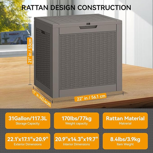 KAMABOKO 31 Gallon Outdoor Storage Box, Resin Deck Boxes Indoor and outdoor, Waterproof Storage Box Lockable Lid for Garden Tools, Package Delivery, Pool Supplies, Patio Cushions, Grey