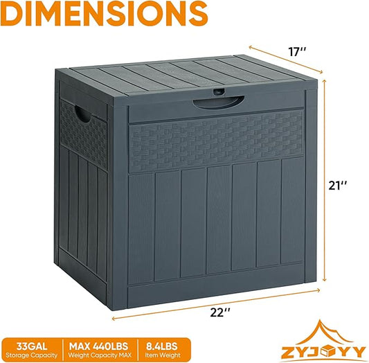33 Gallon Resin Deck Box, Weatherproof Outdoor Storage Box for Patio, Garden, Pool, and Yard, Lockable Waterproof Bin for Tools, Cushions, and Accessories, Grey