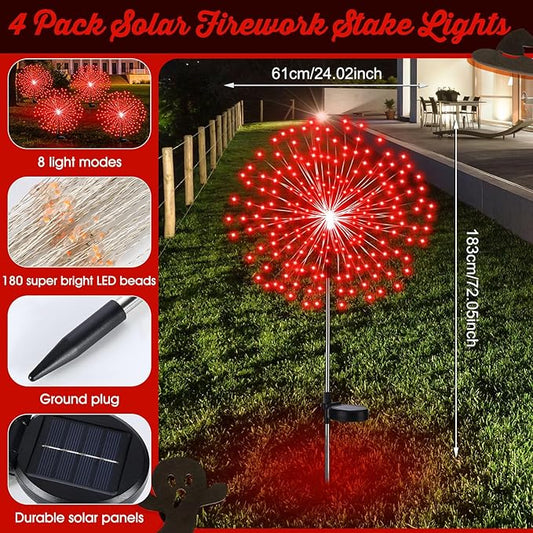 4 Pack Halloween Solar Lights Outdoor Christmas Solar Firework Lights with 180 LEDs 8 Modes LED Firework Decoration Waterproof Landscape Pathway Stake Sparkler Decor for Garden Driveway (Red)