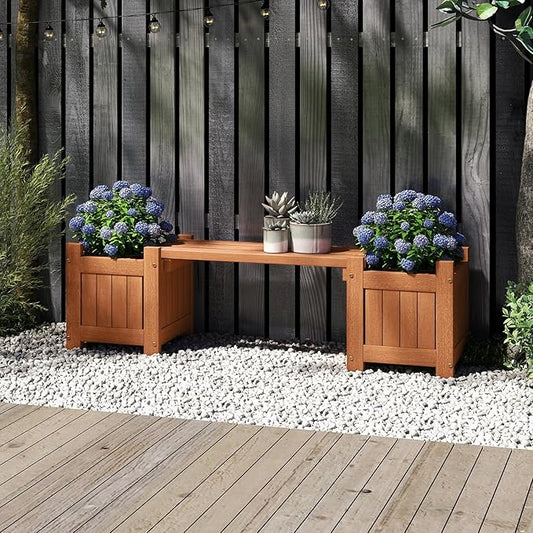 Giantex 2-in-1 Outdoor Bench with 2 Raised Garden Beds, Wood with Teak Oil Finish, Planter Boxes with Open-Ended Base, Garden Bench Seat for Porch Balcony Lawn Yard, DIY Assembly, 42"x11"x11.5"