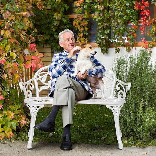 VINGLI 38.5" Patio Park Garden Outdoor Metal Rose Bench,Cast Iron Cast Aluminium Frame Antique Finish Chair,Accented Lawn Front Porch Path Yard Decor Deck Furniture for 2 Person Seat(White