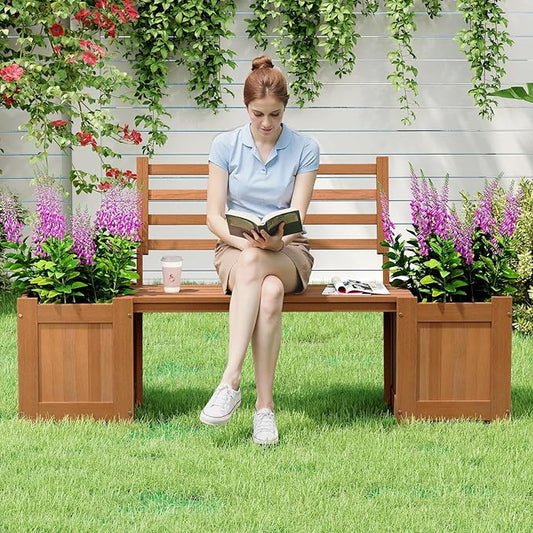 Giantex 2-in-1 Outdoor Bench with Backrest & 2 Raised Garden Beds, Wood with Teak Oil Finish, Planter Boxes with Open-Ended Base, Garden Bench Seat for Porch Balcony Lawn Yard, DIY Assembly