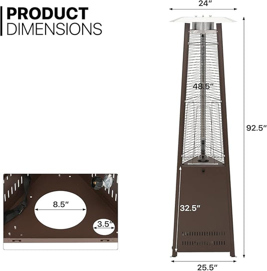 MoNiBloom 42000 BTU Propane Pyramid Patio Heater with Wheels and Glass Tube Flame Burner Outdoor Patio Heater for Commercial Use, Residential, Garden, Backyard, Porch, Deck, Balcony (Coffee Brown)