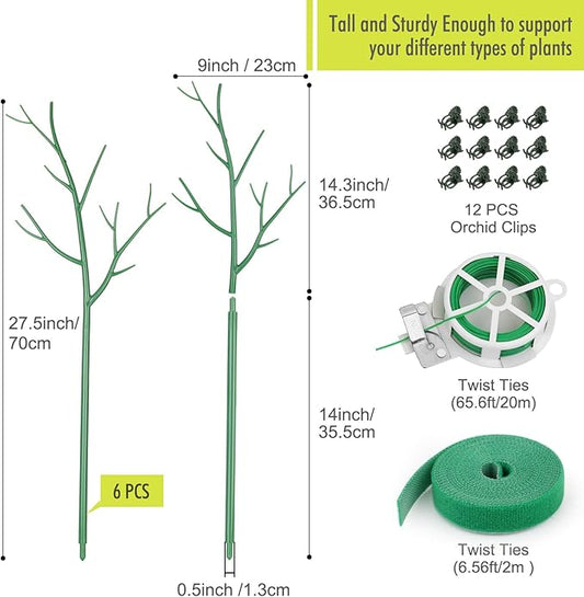 6 Pack Plant Support Stakes for Indoor Plants, 27.56 Inch Twig Plant Sticks with Orchid Clips Twist Ties and Plant Ties for House Potted Plants and Flower, Plastic Branches Support Structures, Green