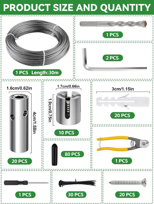 185PCS Wire Trellis for Climbing Plants, Kalolary 100FT Wall Wire Trellis Kit T316 Steel Garden Trellis with Cable & Cutter Wall-Mount Grape Vine Trellis for Outdoor DIY Flower Wall (Cylindrical)