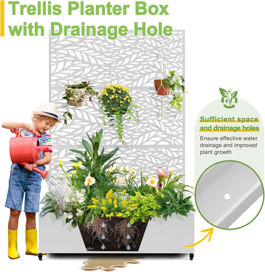 FENCY Metal Raised Garden Bed with Wheels and Trellis,73"x47"x16" Planter Box for Climbing Plants, Vegetables & Vines, Features Privacy Screen and Drainage Holes (White-Leaf)