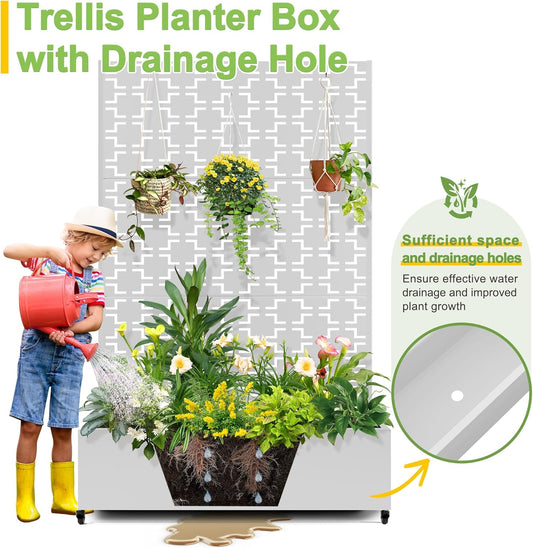 FENCY Metal Planter Box with Diamond Lattice Trellis Planter Box for Climbing Plants/Vines, Galvanized Raised Garden Bed On Wheels, Garden Bed with Trellis(73"x47" White)