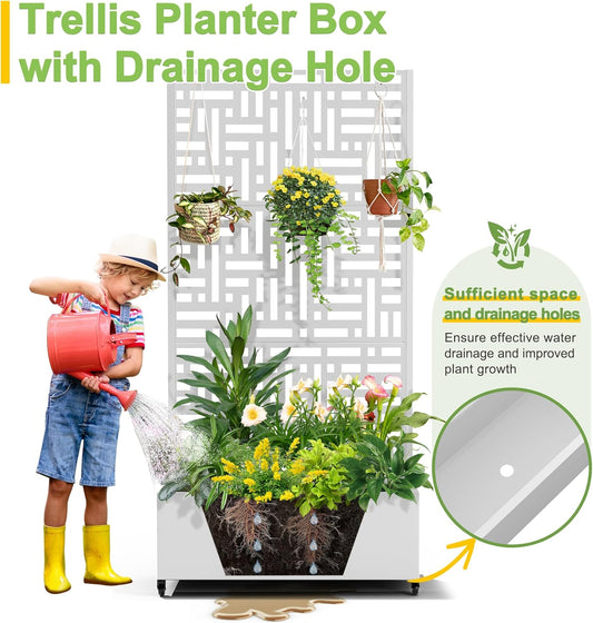 FENCY Metal Raised Garden Bed with Wheels and Trellis,73"x35"x16" Planter Box for Climbing Plants, Vegetables & Vines, Features Privacy Screen and Drainage Holes (White-Geometric Lattice)
