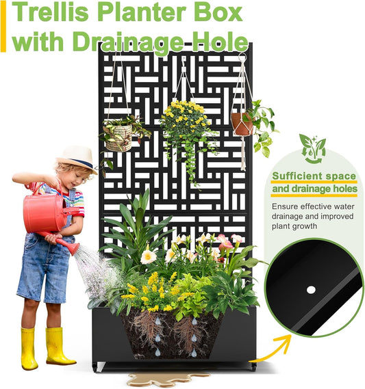 FENCY Metal Raised Garden Bed with Wheels and Trellis,73"x35"x16" Planter Box for Climbing Plants, Vegetables & Vines, Features Privacy Screen and Drainage Holes (Black-Geometric Lattice)