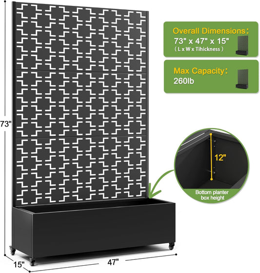 FENCY Metal Raised Garden Bed with Wheels and Trellis,73"x47"x16" Planter Box for Climbing Plants, Vegetables & Vines, Features Privacy Screen and Drainage Holes (Black-Brick)