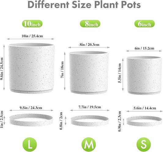 10/8/6 inch Deep Flower Pots, Cylinder Large Plant Pots for Outdoor Indoor Plants, 3 Pack Tall Plastic Planters with Drainage Holes and Saucers for Garden House Plants, Speckled White