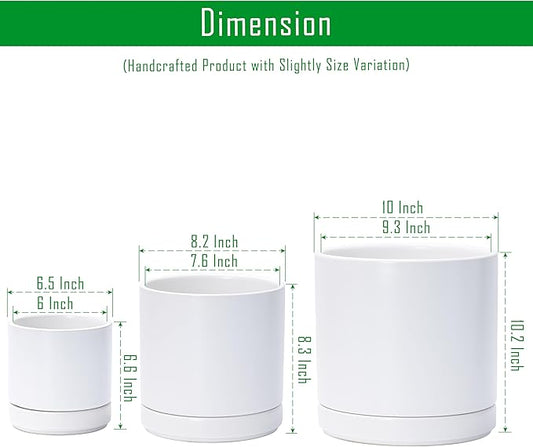 D'vine Dev 6 Inch & 8 Inch & 10 Inch, Set of 3 Round Ceramic Planter Pot with Drainage Hole and Saucer, White, 94-T-L-1